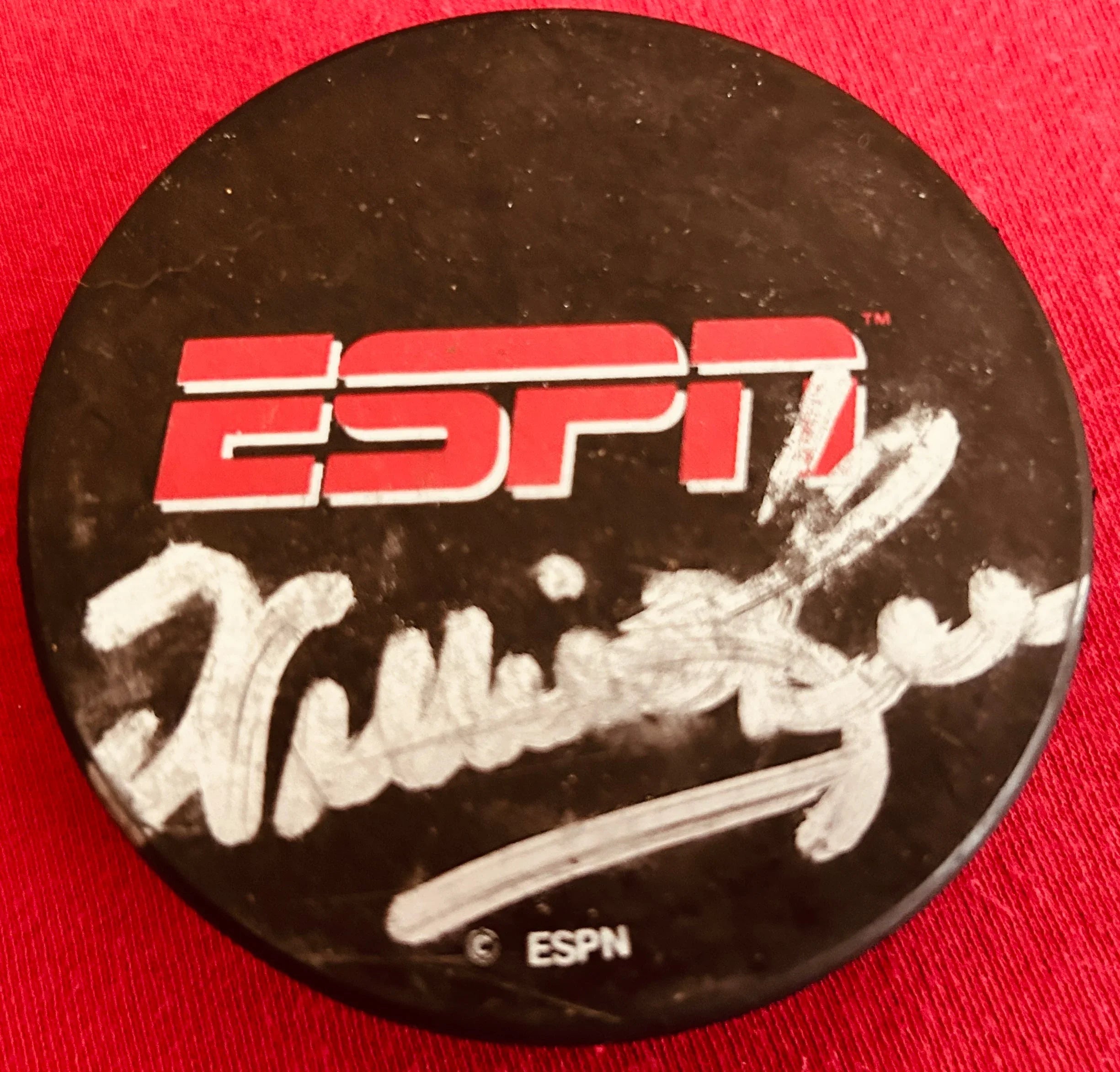 Vintage ESPN logo National Hockey Night hockey puck autographed in thick silver paint pen by Willie O'Ree, the first black to play in the NHL. Authenticated by JSA with their matching numbered sticker on the back and certificate of authenticity card. NOTE: signature has minor to moderate rubbing. ONLY ONE AVAILABLE FOR SALE.
